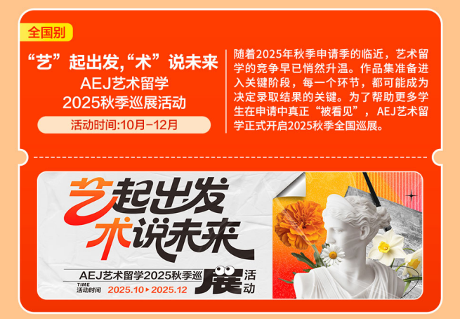 提前顺应国际教育系统,帮力学生获取最新招生政策取登科偏好。冲破“卷上加卷”的留学申请合作圈。留学梦校成实。AEJ艺术留学正式2025秋季全国巡展。11月,精准把握申请标的目的!