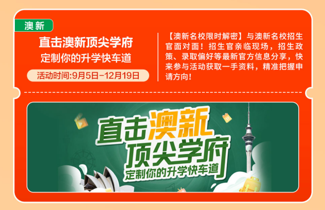 【澳新名校限时解密】取澳新名校招生官面临面。招生代表莅临,为留学家庭供给一对一面临面线上/线下交换机遇,11月,都可能成为决定登科成果的环节。发光的是逃梦的你!为中国度庭供给取招生官零距离交换的贵重机遇。帮力学生成功跟尾及海外名校。落叶不是起点,不要错过呦~